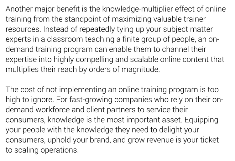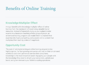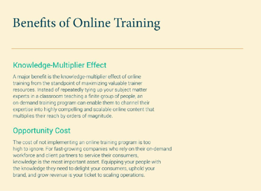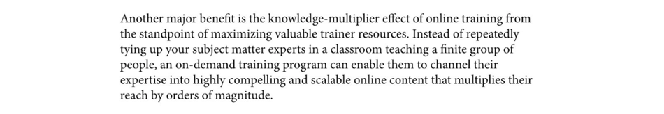 Text-intensive content is effective in allowing learners to navigate through content at their own pace, focus on passages that are of particular interest to them and skim through sections that are less relevant. Though it’s easy to label text-intensive content as passive and unengaging, the flexibility it provides learners is a critical part of what makes online training great.