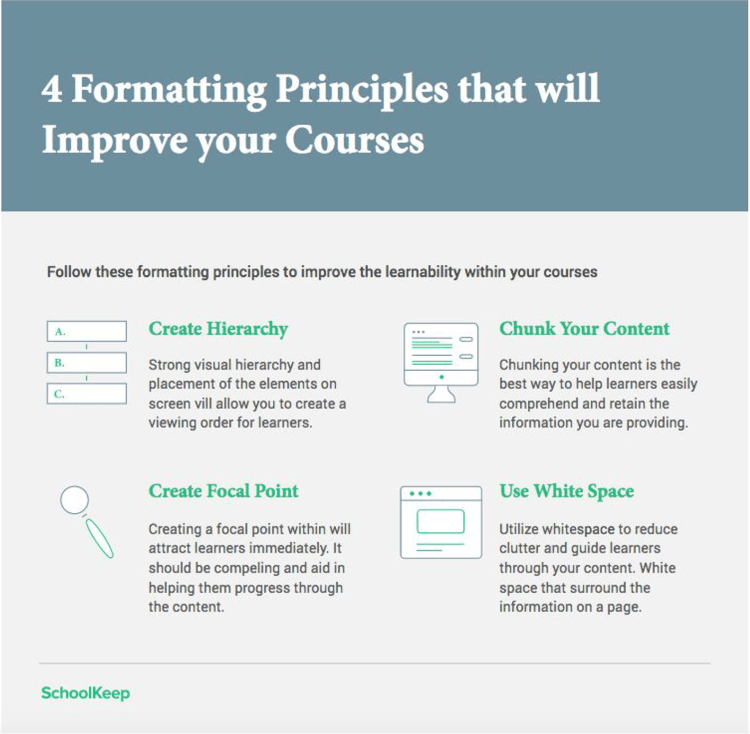 Once you select your typefaces, formatting method and image style, keep everything consistent throughout your course. Use the same one to two typefaces throughout your course. If there’s a specific icon style you like, use the same style in every learning activity.