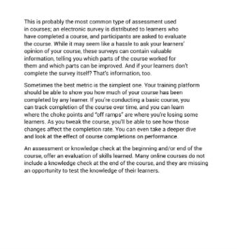 The best training courses begin by engaging learners with great content, then confirm learner mastery of the content, success in applying knowledge and satisfaction with the course as a whole by leveraging the aforementioned assessment tools.
