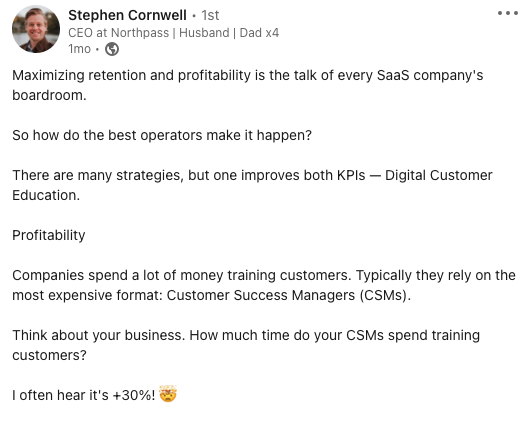 Founder & CEO of Northpss, Steve Cornwell, posted to LinkedIn (snippet below) that he often hears from Customer Success leaders that CSMs spend about 30% of their time training customers.