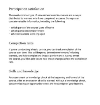 Assessing learner success requires a tool for measuring competency, engagement and feedback. Competency is typically measured using quizzes and assignments. Feedback can be measured through surveys and discussions. And engagement is best measured through analytics. Most training platforms will provide you with engagement data and reporting capabilities. In this section, we’ll focus on developing quiz questions, assignments, discussion prompts and feedback surveys.